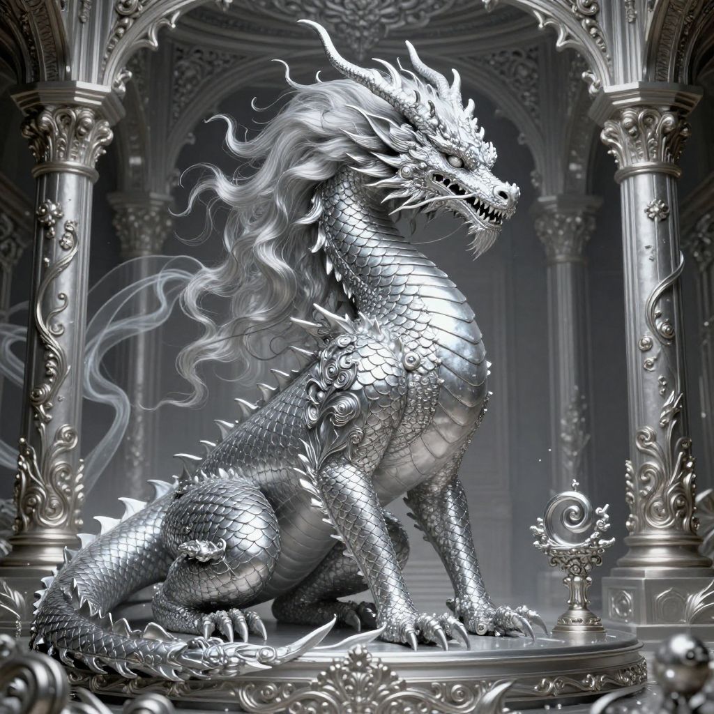 Detailed artwork of a mystical silver-scaled dragon with a flowing mane and intricate scales. The dragon exudes an enigmatic and ethereal aura, combining vintage charm with a futuristic vintagepunk aesthetic. It is positioned in an elaborate architectural setting with ornate pillars and swirling designs, showcasing a powerful and magical female monster presence.