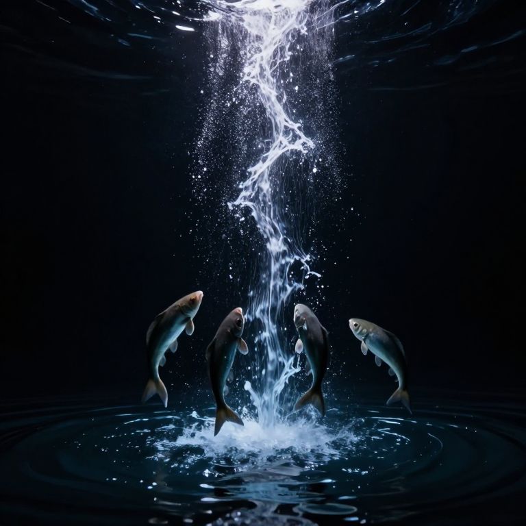 Liquid light cascades downward from a radiant beam, illuminating four shadowy fish as they leap gracefully backward through the dark, rippling water beneath a pitch-black sky.