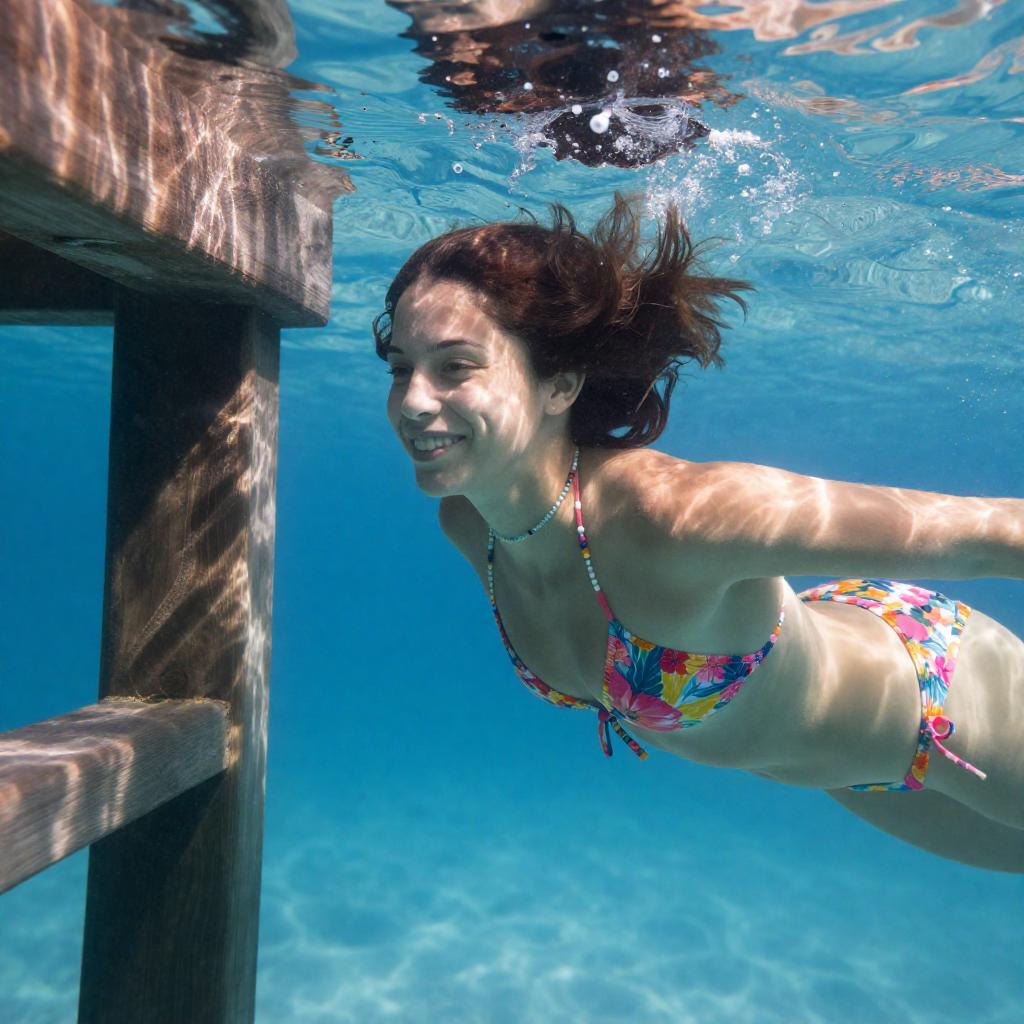 Photograph of a smiling woman with fair skin and dark brown hair, wearing a colorful floral bikini and a beaded necklace, swimming underwater. She is positioned to the right of a sunlit, ured wooden structure. Her hair floats upward, and the clear blue water surrounds her.