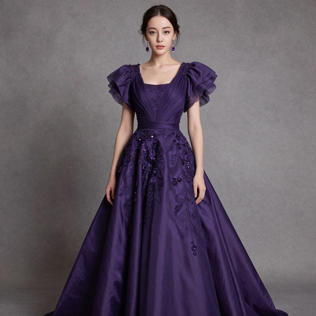 Photograph of an Asian woman with fair skin and dark hair, styled in an elegant updo, standing against a gray textured background. She wears a full-length, deep purple satin gown with puffed short sleeves and a fitted bodice adorned with intricate floral embroidery. The gown has a voluminous skirt that flares out. She accessorizes with dangling blue earrings. Her expression is neutral, and she stands with her arms relaxed by her sides. The overall style is formal and sophisticated, with a focus on luxurious fabric and detailed embroidery.