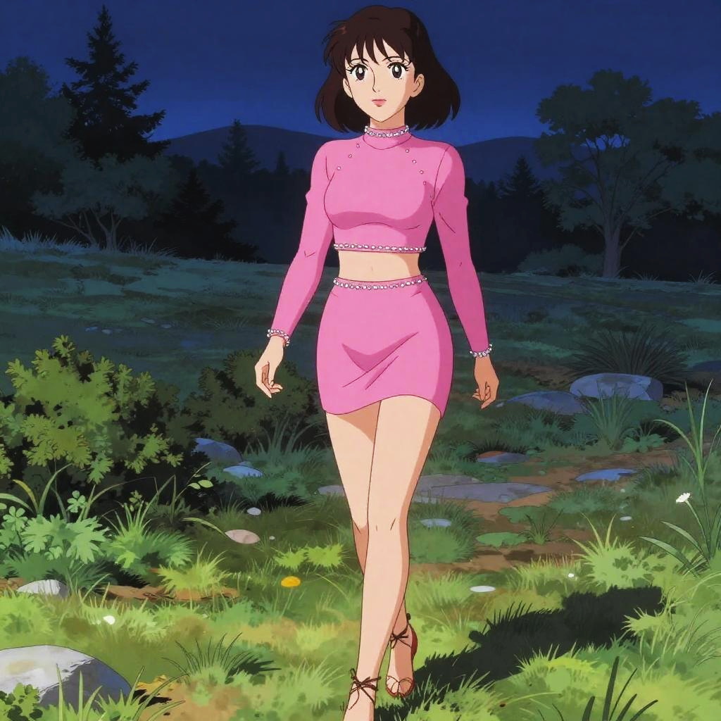 A Stocky woman, in an edgy glam style with a leopard print crop top and high-waisted black vinyl skirt, stands at the vintage boutique in a narrow alleyway, surrounded by eclectic decor, in a Studio Ghibli-inspired scene. Sexy. Pretty face and beutiful eyes