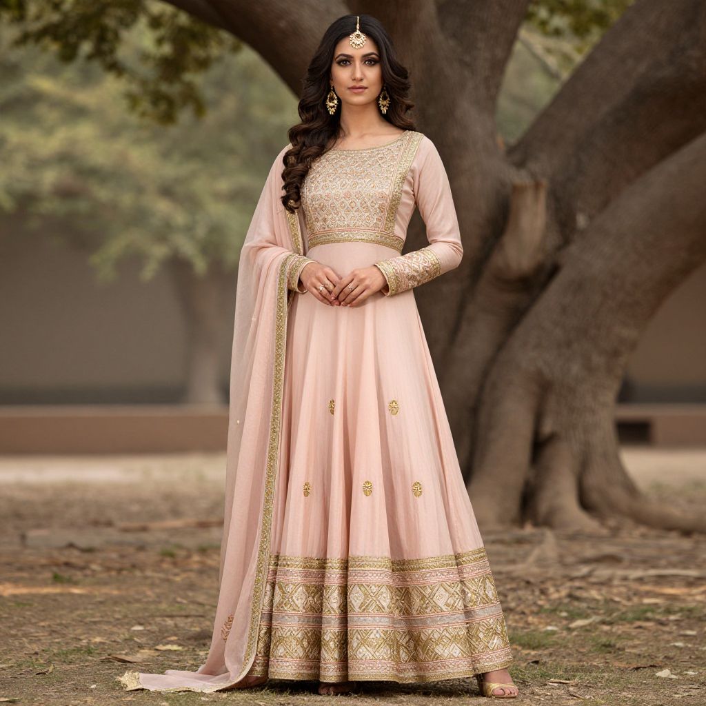 Anarkali Suits Costume, a woman in a pink and gold outfit standing in front of a tree