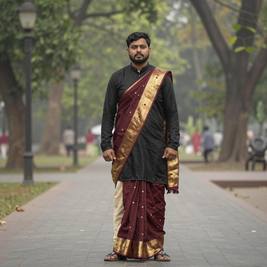 Kanna costume, photograph of Indian man, standing on pathway in park, daytime, natural light, traditional outfit, maroon and gold saree with black long-sleeve shirt, cream pants, sandals, tall black hair, medium build, serious expression, lush green trees in background, blurred bokeh effect, casual, portrait orientation, outdoor, serene atmosphere, realistic style, natural colors