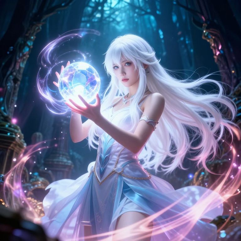 A digital fantasy artwork depicts a young, fair-skinned woman with long, flowing white hair, standing in a dark, mystical forest. She wears a blue, ethereal dress with gold accents and an armband. She holds a glowing, orb-like ball of light with swirling pink and blue energy, illuminating her face and surroundings. Her expression is focused and magical. The background features blurred, ancient stone structures and twinkling lights, enhancing the mystical ambiance. The image has a vibrant, luminous quality, with the character's hair and dress appearing almost translucent.
