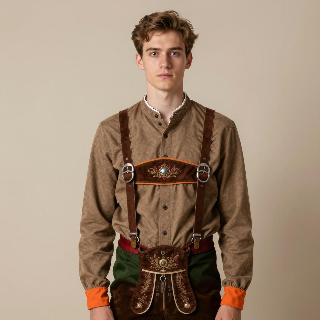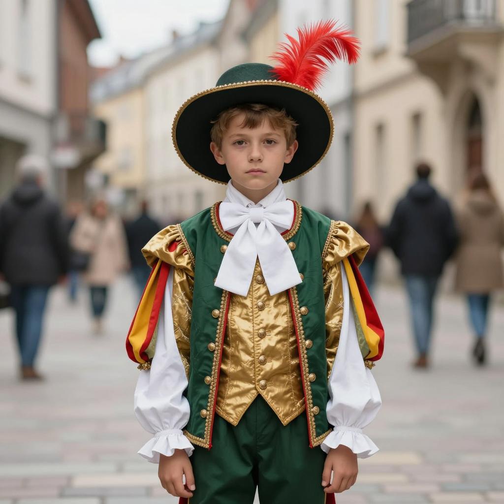 Beer costume, photorealistic, man, standing, medieval-style clothing, ornate red and gold hat with white fur trim, green scarf, detailed embroidered jacket with gold and red patterns, serious expression, blurry outdoor background, people walking, daytime, historical costume, close-up, street setting, slightly overexposed lighting