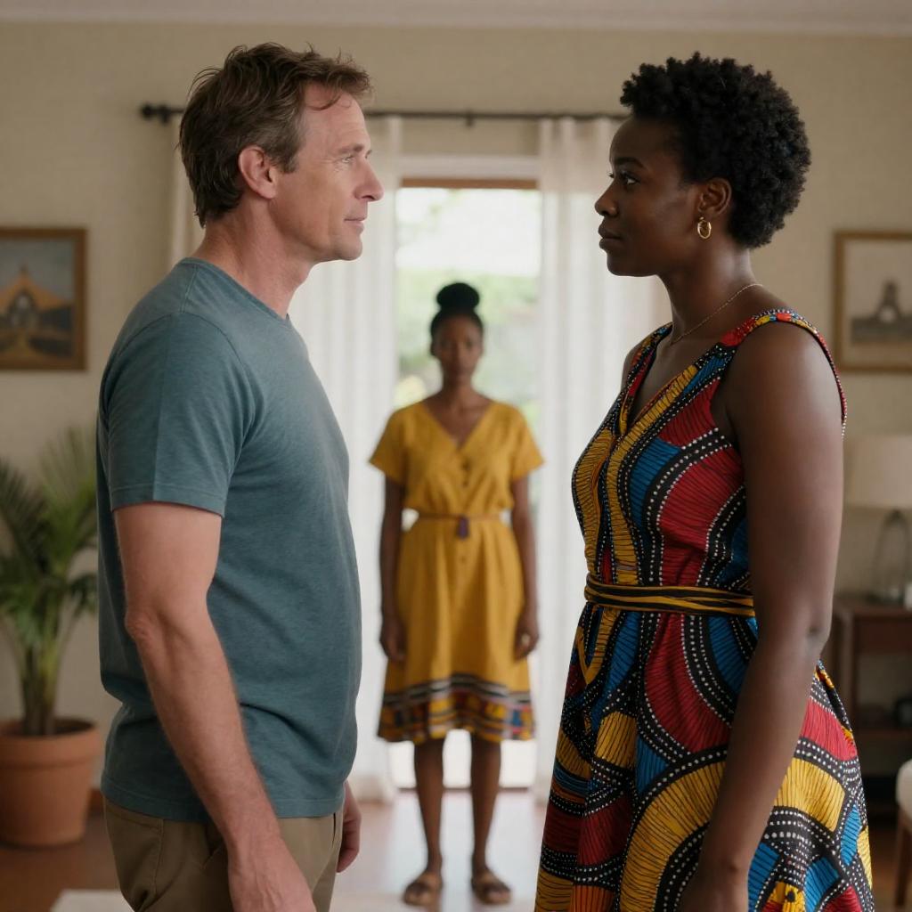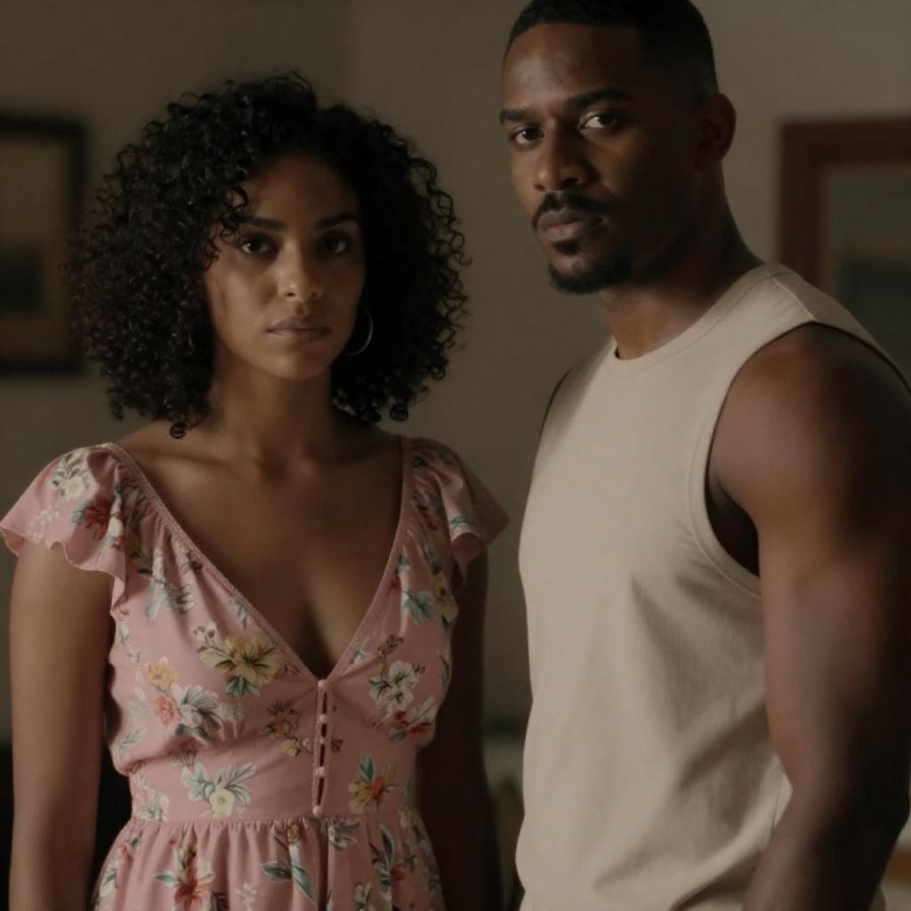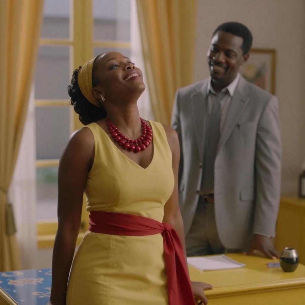 Photograph of two Black people in a 1960s-style kitchen. Man with short hair, light gray shirt, arms crossed, serious expression. Woman with short curly hair, orange dress, side profile, neutral expression. Yellow curtains, white shelves, yellow objects in background. Man on right, woman on left.