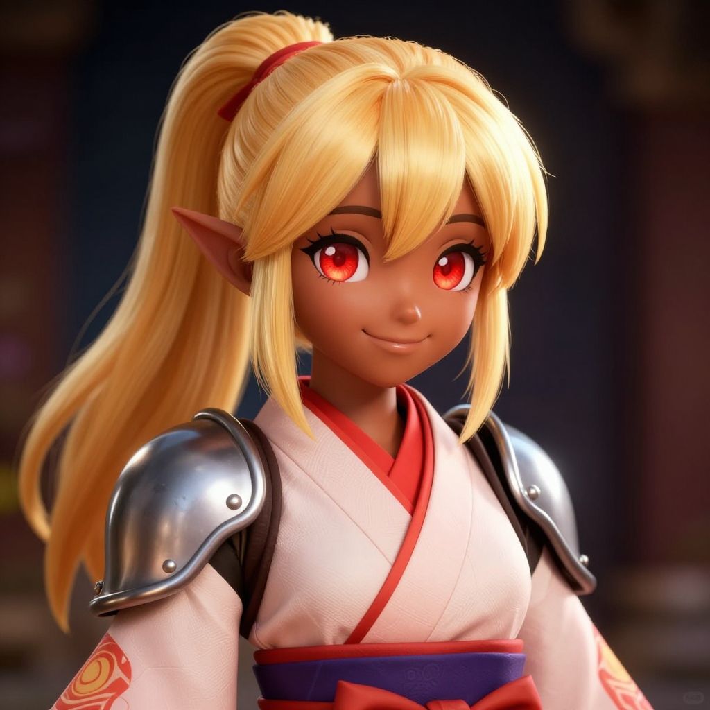This is a digital CGI portrait of an anime-style elf woman with dark brown skin and large, bright red eyes. She has long, blonde hair tied in a high ponytail with a red hairband. Her pointed ears are prominent. She wears a white kimono with red trim and a blue obi, and silver armor shoulder plates. The background is blurred, dark, and indistinct, focusing attention on her. Her expression is friendly, with a slight smile. The image has a glossy, high-detail finish, emphasizing the character's vibrant colors and smooth textures.