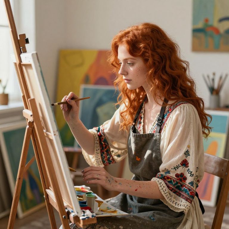 Young woman with long red curly hair wearing a white bohemian embroidered blouse and gray apron, painting on a canvas in a sunlit art studio. She is seated at an easel with paint splatters on her hands and apron, surrounded by colorful canvases and painting tools. Natural light softens her focused expression in a creative atmosphere.
