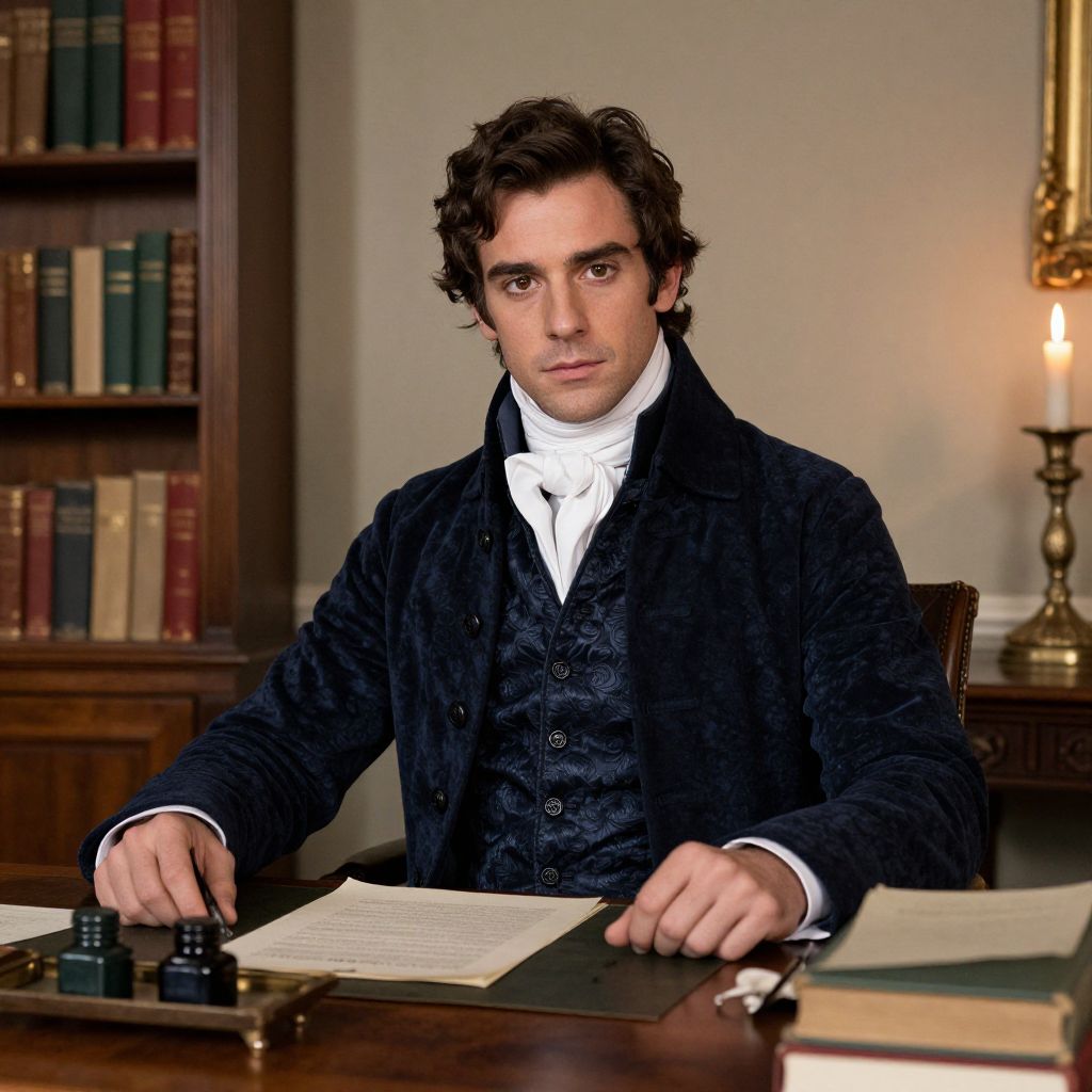 A handsome man in his early 30s with a strong jawline and dark brown eyes dressed in classic Bridgerton attire—wearing a tailored waistcoat, a velvet waistcoat, and a cravat—sitting at a wooden desk in a period-style library with books and inkwells, soft candlelight casting shadows on the walls.