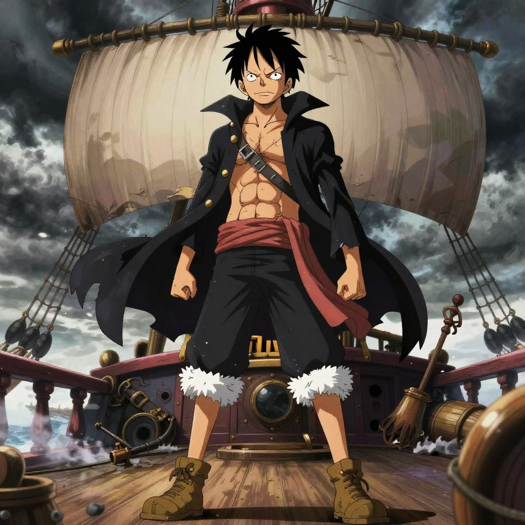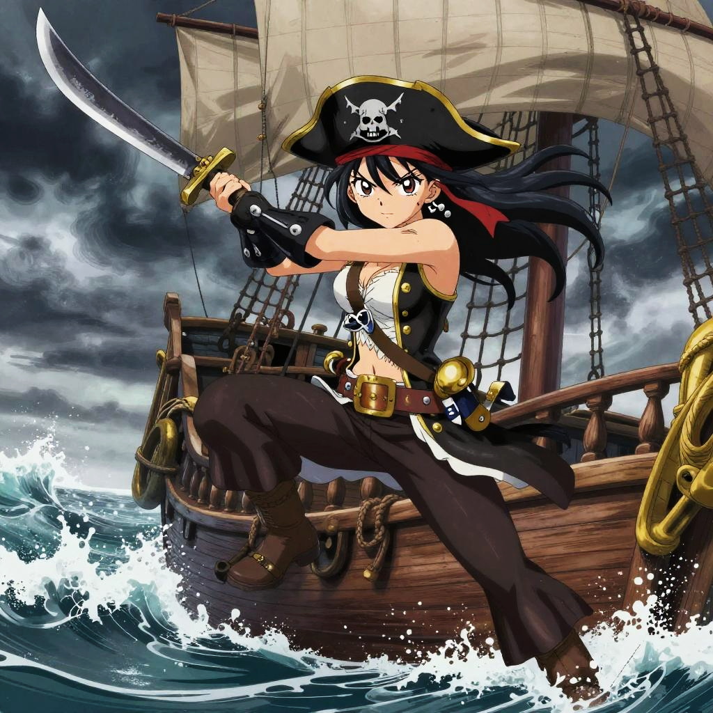 Epic pirate girl anime scene, sailing through misty sea, long coat with pirate insignia, wild hair blowing in wind, vivid sky with seagulls, high contrast shadows highlighting fierce determination