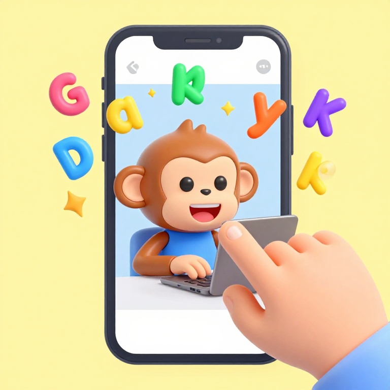 Digital illustration of a cute, cartoon-style brown monkey with large black eyes, wearing a blue shirt, typing on a laptop. The monkey is displayed on a smartphone screen with a black border. A human hand with a light skin tone is shown tapping on the screen. The background is a solid pale yellow, with colorful letters "G A K D K" in pink, green, yellow, and blue surrounding the phone. The style is vibrant and playful, with a focus on child-friendly aesthetics.