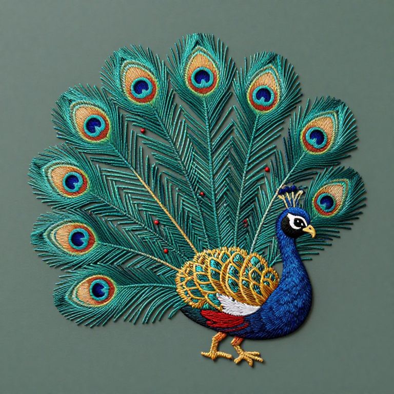 Embroidery Stitch Dictionary peacock with teal feathers, red, gold against green grey background ar2:3,