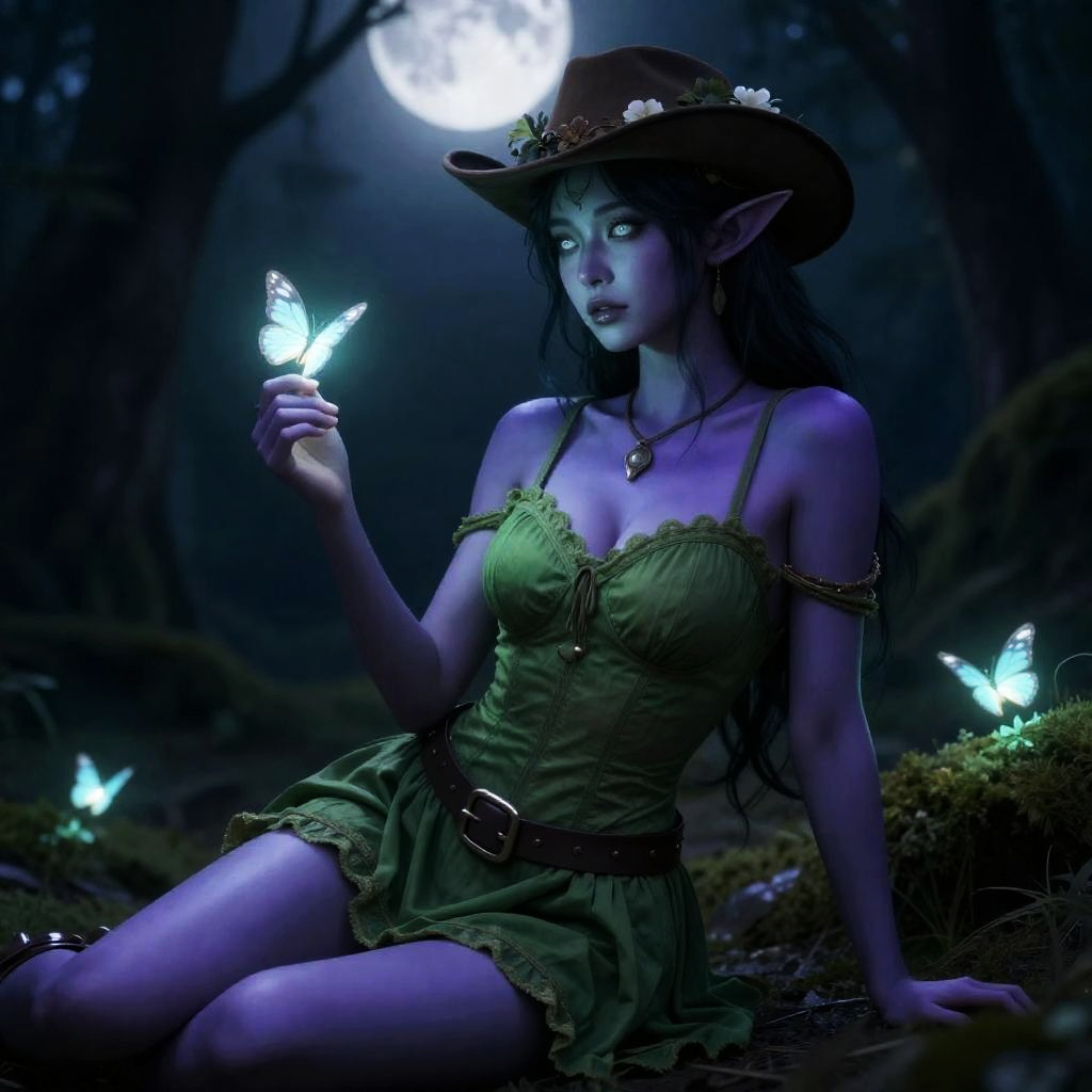 Photorealistic image of a purple-skinned elf druid with white eyes and black hair, sitting in a dark forest at night. She wears a green dress with a brown belt, and a wide-brimmed brown hat decorated with flowers. The scene includes glowing butterflies illuminated by volumetric moonlight, creating a mystical and dark fantasy atmosphere.