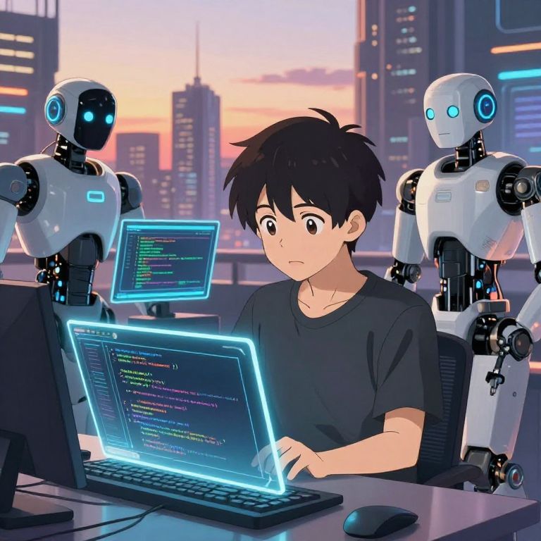 AI maker anime scene featuring a young genius programmer surrounded by advanced AI robots, coding complex algorithms on transparent digital tablets, with a futuristic city skyline at sunset, in detailed anime art style with soft lighting and expressive emotions.