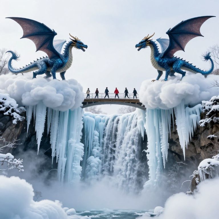 Fantasy illustration of two blue dragons standing on icy cliffs, facing each other, above a frozen waterfall with people crossing a bridge. Snow-covered landscape and