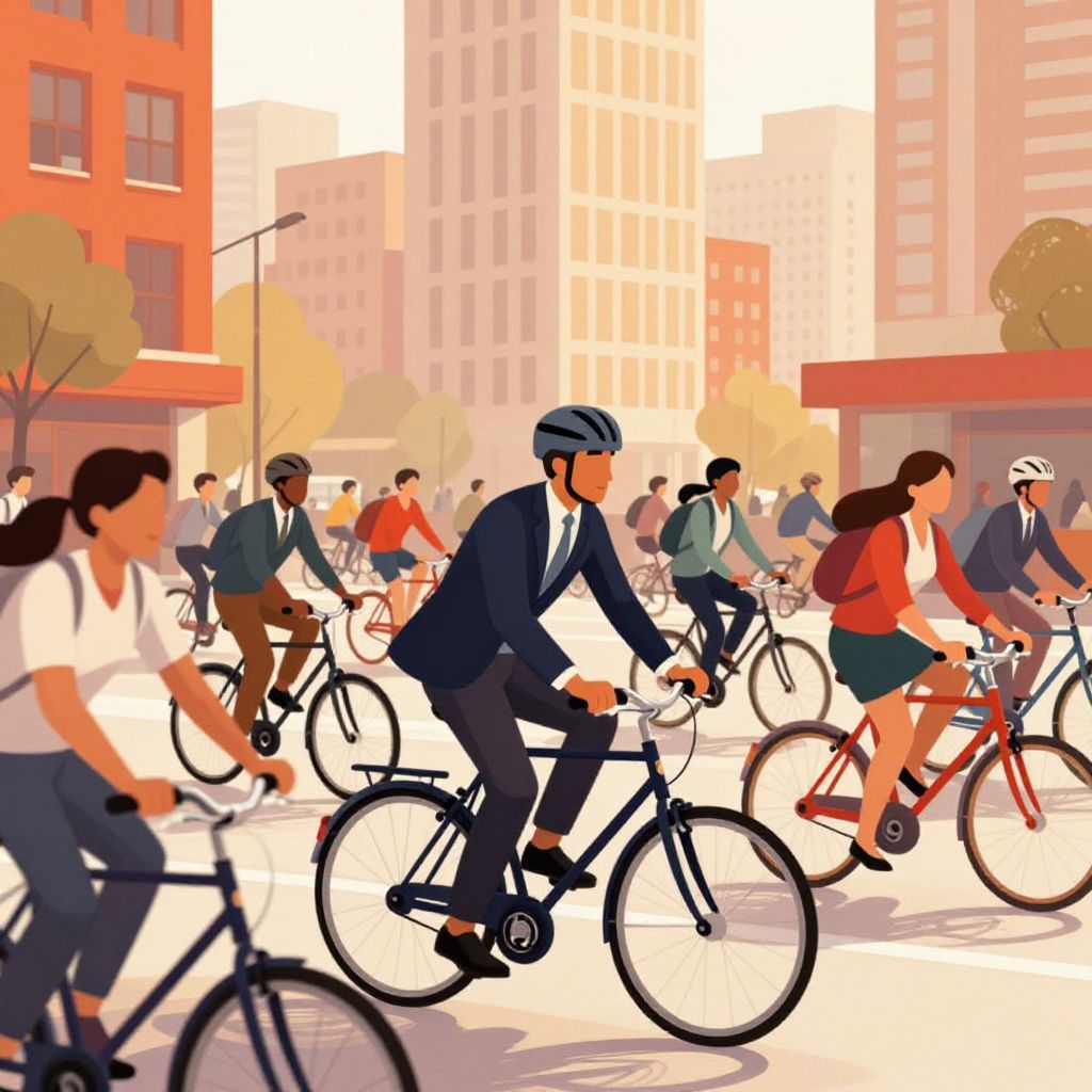 This digital illustration depicts a bustling urban street scene with numerous people riding bicycles. The foreground features a man in a navy suit and black helmet riding a black bicycle, positioned centrally. Surrounding him are diverse individuals, including a woman in a white shirt and black pants, another in a red top and black skirt, and a man in a blue shirt and dark pants. The background showcases tall, modern buildings in warm orange and beige hues, with trees and street lamps adding to the cityscape. The overall style is vibrant and modern, with bold colors and clean lines, creating a dynamic and lively atmosphere.