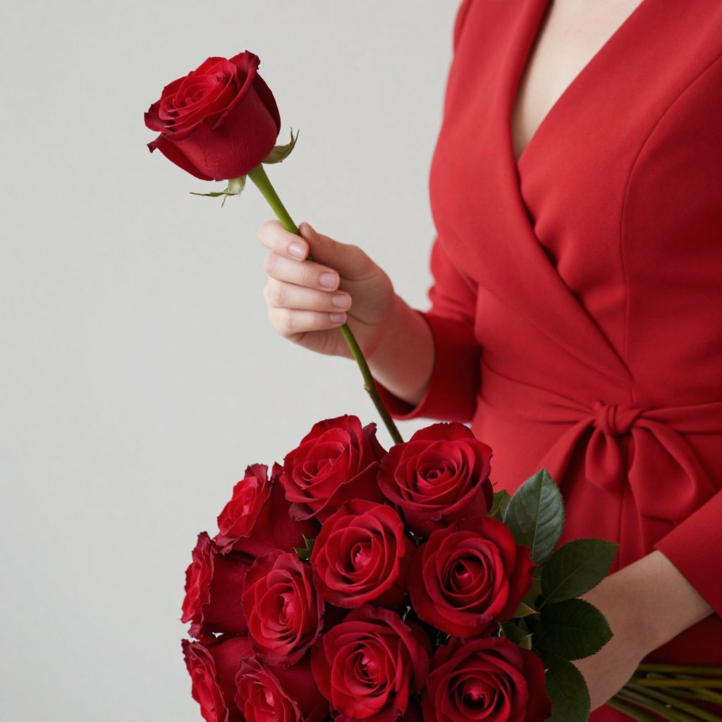 Elegant red roses and a striking red dress showcase romantic elegance, with a hand delicately holding a single rose above and a bouquet of vibrant red roses below, complementing the woman's sophisticated attire.