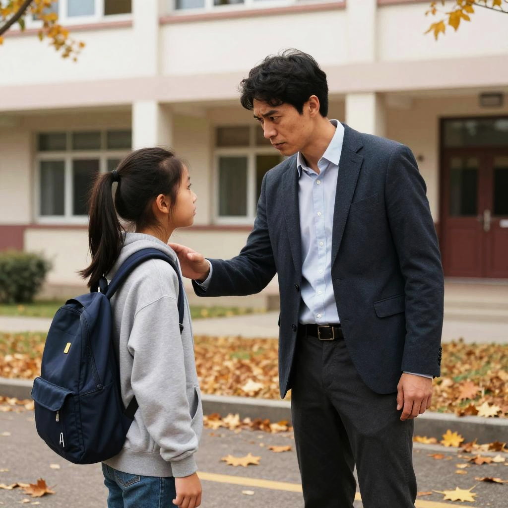 Teacher scolding student sternly outside school building, natural daylight, autumn setting with fallen leaves, emotional faces, realistic environment, high detail with a dramatic atmosphere