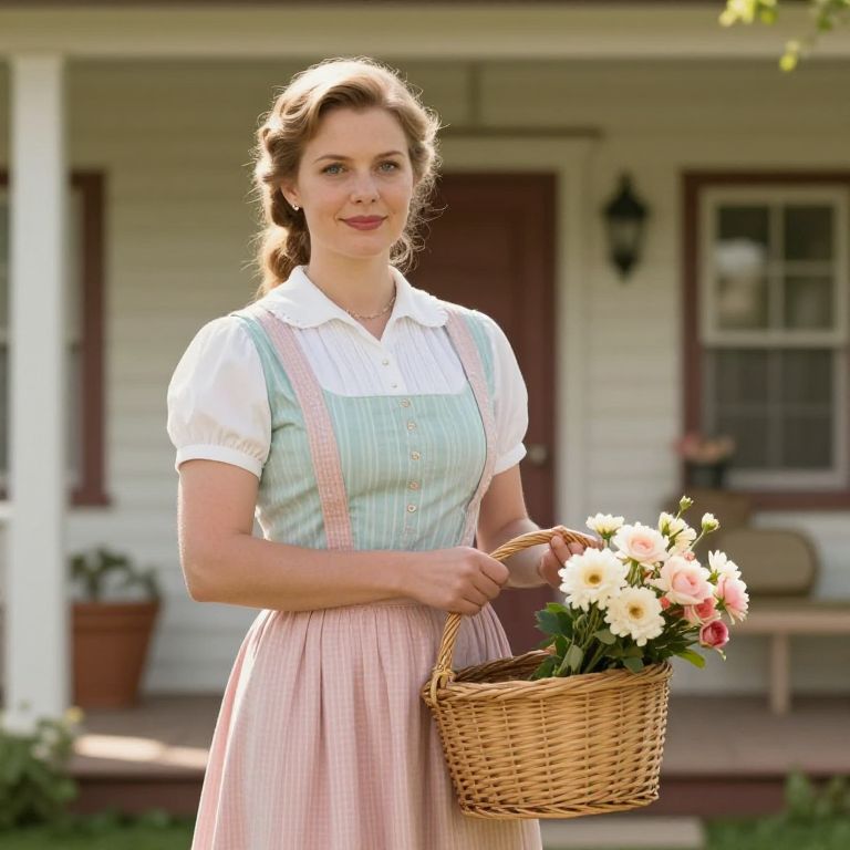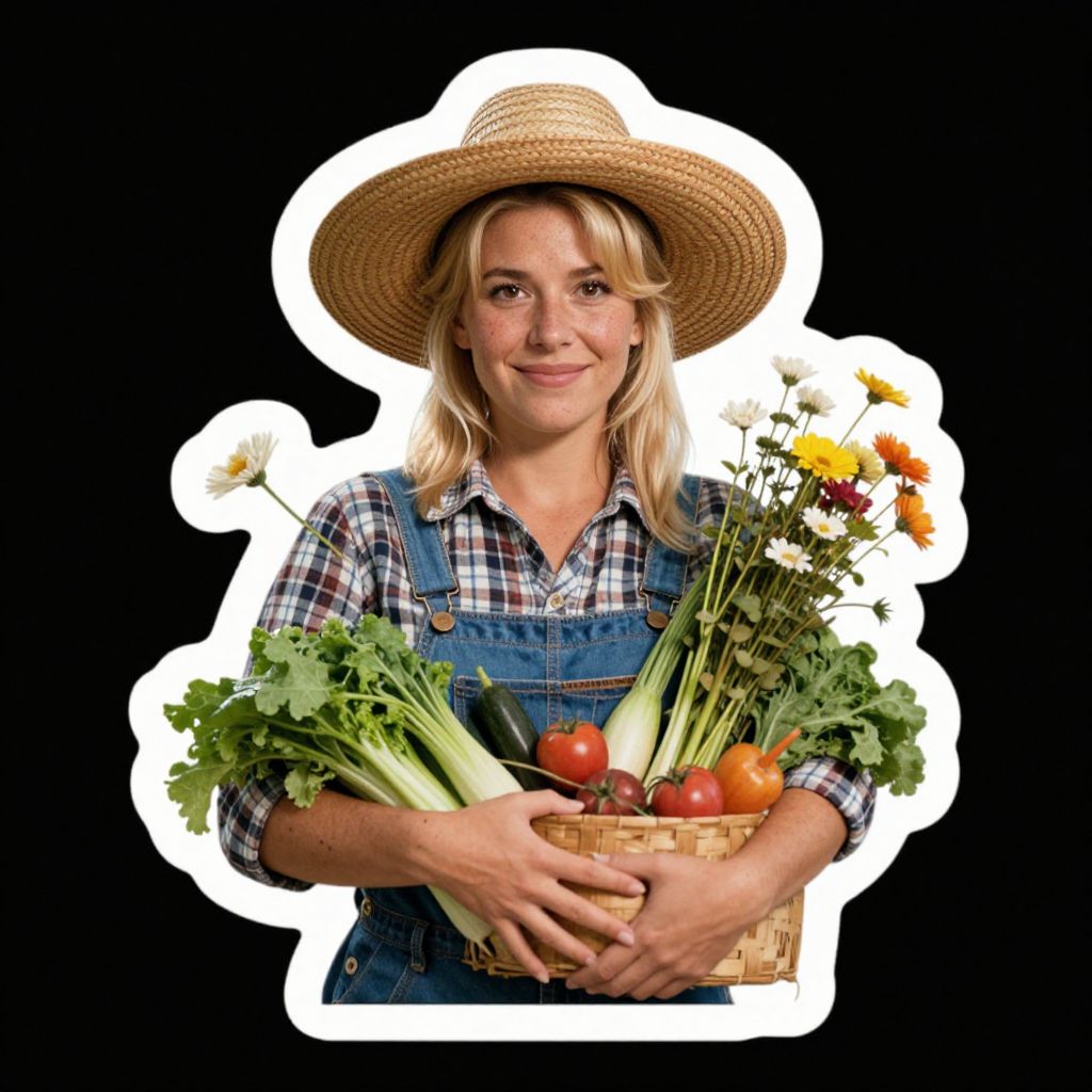 Retro Film sticker of a grubby 30 something woman blonde farmer wearing a straw hat, overalls, vegetables, smirking, flowers - Upscaled (Light) by,