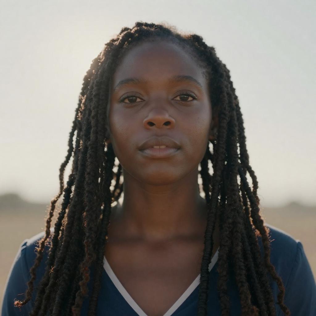 A captivating portrait of Chimamanda Ngozi Adichie in the style of Édouard Manet, showcasing her contemplative gaze, poised confidence, and softly braided hair with a subtle pen tucked at her collar against a softly shaded background.