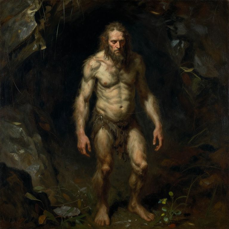 Weather Sealing A scrawny treant standing in an overgrown cave, dim lighting, subject partially obscured, Ilya Repin,