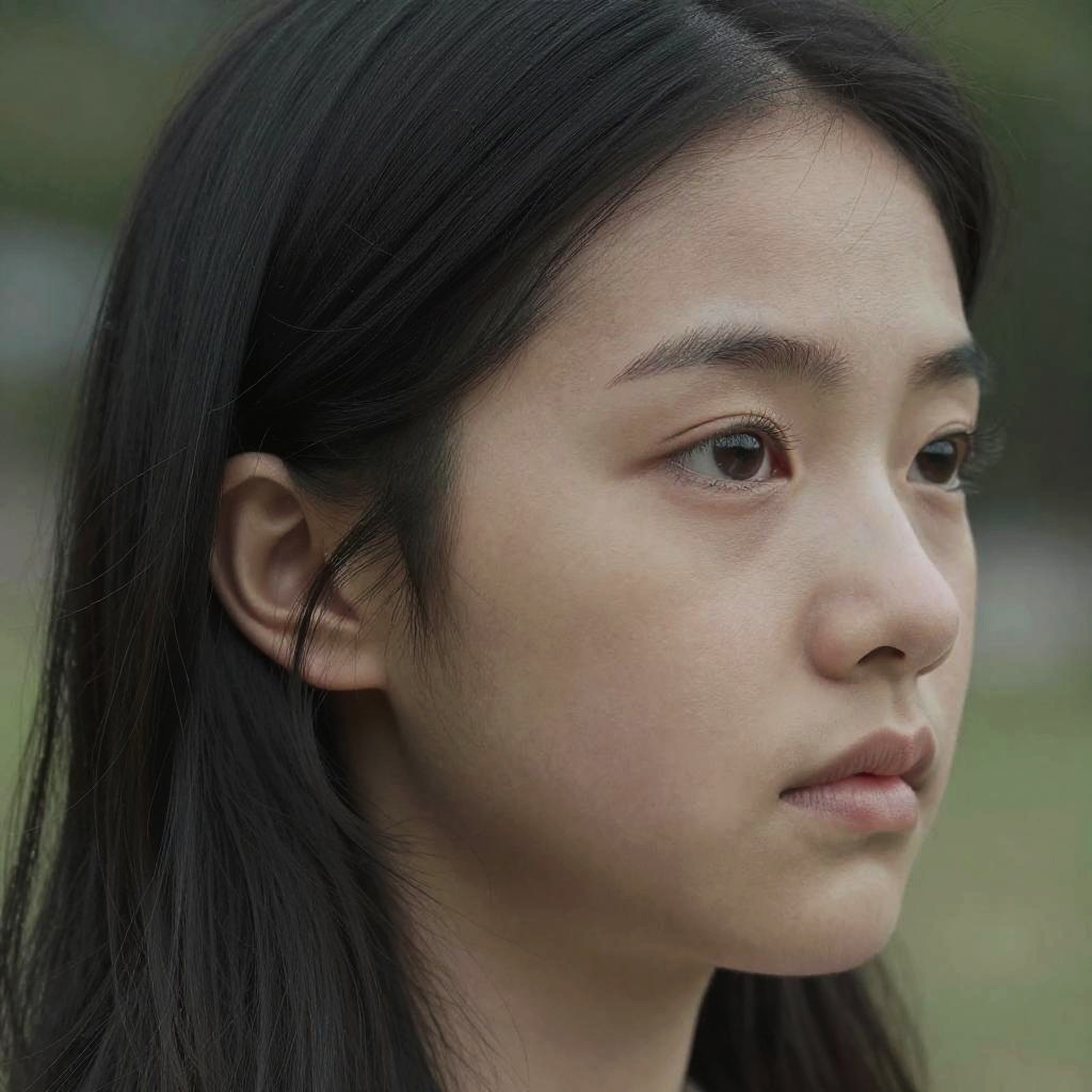Photograph of an Asian woman with long, straight black hair, fair skin, and brown eyes, gazing to the right. Her expression is neutral, with slightly parted lips. The background is blurred, showing green and gray tones, suggesting an outdoor setting. The image focuses on her face, highlighting her smooth skin and delicate features. The lighting is natural, emphasizing the soft texture of her skin and the subtle shine in her hair. The overall composition is close-up, capturing her from the shoulders up.