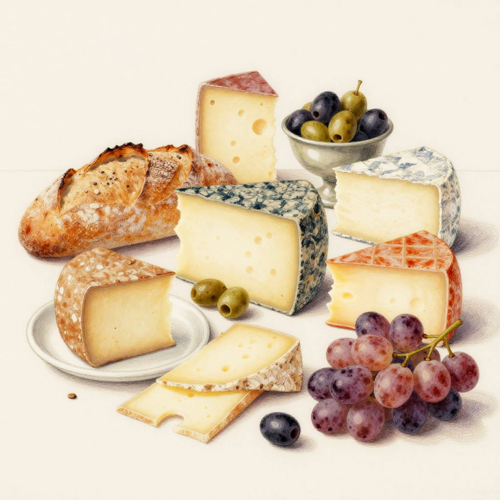Queso drawing of a rustic Mexican kitchen scene with a wooden table covered in melting cheese, vibrant chili peppers, fresh herbs, and traditional pottery, painted in warm earthy tones with a sketchy, hand-drawn style and textured pencil strokes.