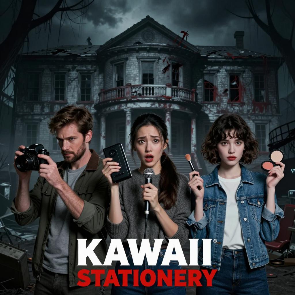 Photograph of a surreal, horror-themed collage. Large, menacing, half-human, half-monster face with one eye, wearing a wide-brimmed hat, centered. Smiling blonde girl with bangs and a pink phone on the right. Smaller images of three men with intense expressions at bottom. Dark, cloudy background with glowing white lights. Monstrous hand reaching towards girl. Dynamic, unsettling composition.