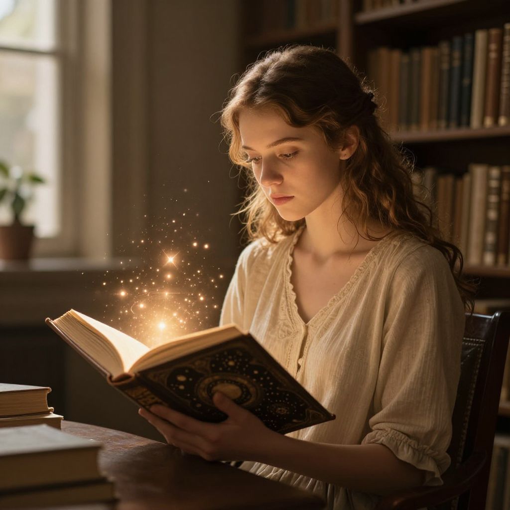 In a serene library bathed in ethereal golden hour light, a young woman engrossed in reading discovers magical sparks emanating from the pages of an ancient tome, hinting at forgotten futures and celestial visions.