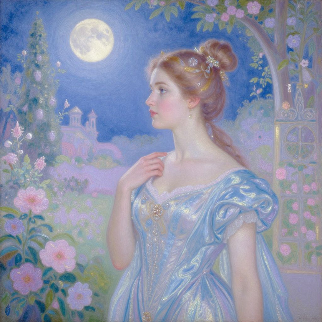 A serene garden under the moonlight, featuring a woman in a blue satin dress with intricate hair, captured in an opulent, pastel-colored, pearlescent oil painting with spiritual and fairytale elements, reminiscent of the style of Daniel Gerhartz and Krenz Cushart.