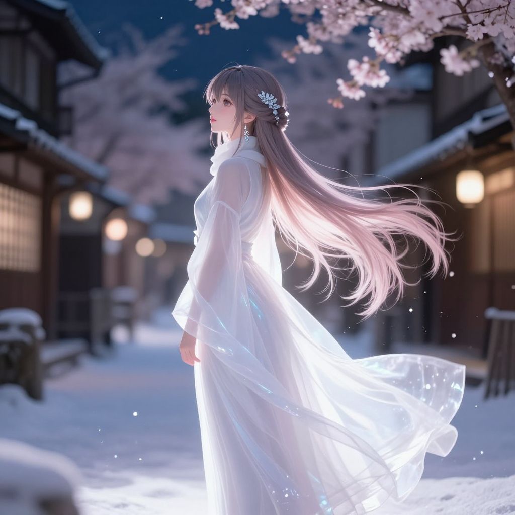 Photograph of an East Asian woman with long, straight, black hair standing in shallow ocean water. She wears a flowing, white, sleeveless dress that billows in the breeze. Sunlight glints off the water, creating a sparkling effect. She faces left, with the sun at her back, casting a bright halo around her. Her skin is fair, and she appears barefoot. The background shows a blurry shoreline with greenery. The image captures a serene, ethereal moment with a soft, dreamy quality.