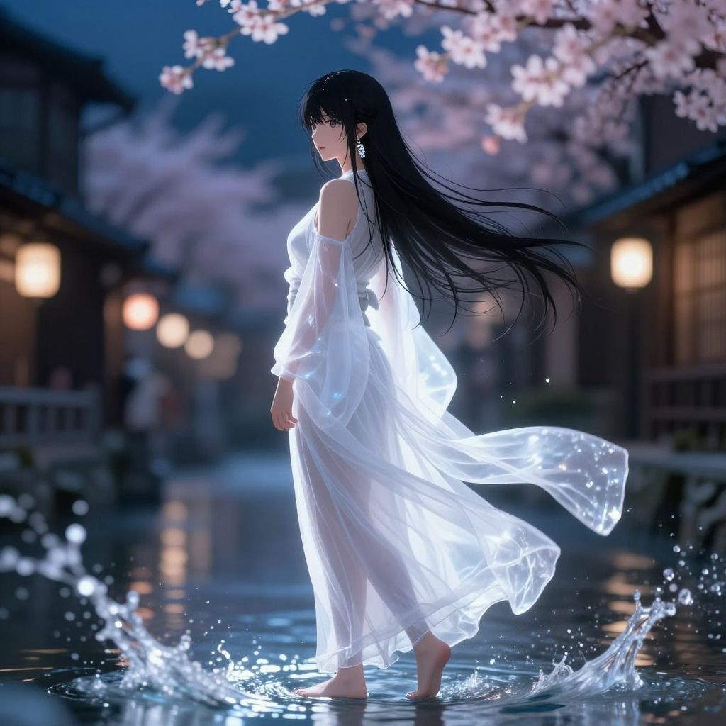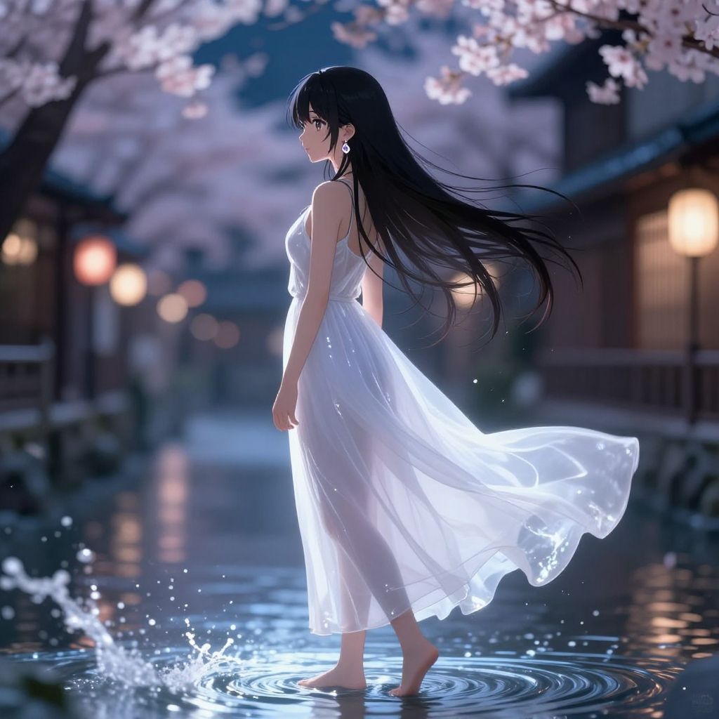 (anime), ((studio anime)), best quality, masterpiece, highly detailed foreground, ambient lighting, ultra-fine painting, extreme detail description, bokeh, side view, beautiful rendering, (blurry realistic very low saturation background), professional, healing, 1girl, beautiful young girl, detailed eyes, detailed face, crystal earring, (very long straight hair flowing), sleeveless, full body, flowing transparent white skirt, bare foot, (backlight:0.5), (silhouette:0.1), sunny, day light, seaside, sparkling light on the water's surface, blurry foreground, water splashing light in air, romantic atmospheric background