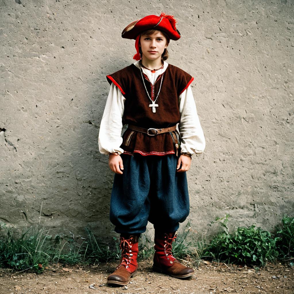 Young boy dressed in a traditional Renaissance peasant costume featuring a red hat, brown vest with red trim, white long-sleeve shirt, blue baggy pants, and brown and red lace-up boots. The boy wears a cross necklace and stands against a plain textured wall with sparse greenery at his feet.