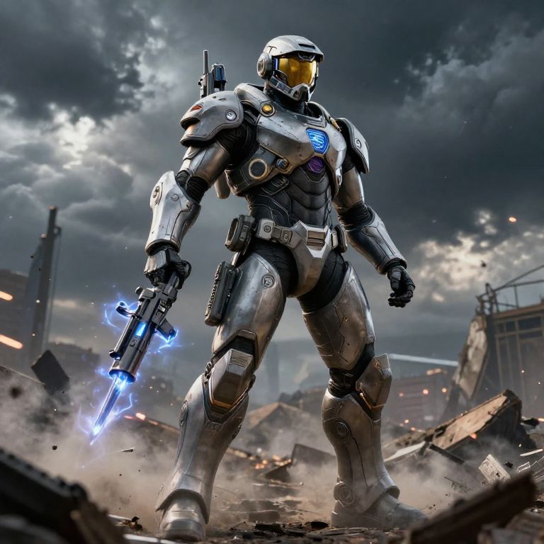Photorealistic digital artwork of a futuristic, silver-armored Space Marine standing amidst a war-torn, ruined cityscape. The heavily armored figure has a yellow-tinted visor and a blue glowing power symbol on the chest plate. He wields a glowing blue energy sword in his right hand and holds a futuristic rifle in his left. The background features a stormy, cloud-filled sky with debris and destroyed buildings, adding a sense of chaos and destruction. The armor is detailed with various compartments and straps, enhancing the sci-fi aesthetic. The scene is dynamic, with dust and debris swirling around the character.