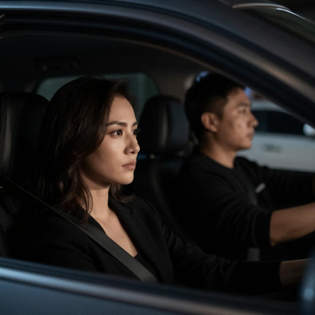 Photograph of a man in a dark suit and a woman in a sports bra and black leggings inspecting an open silver car hood. Man stands to the left, woman bends over the car. Parked cars in background, "Sticks Coffee" sign. Woman's hair in a ponytail, serious expression. Man's expression neutral. Green plant between cars. Daylight.