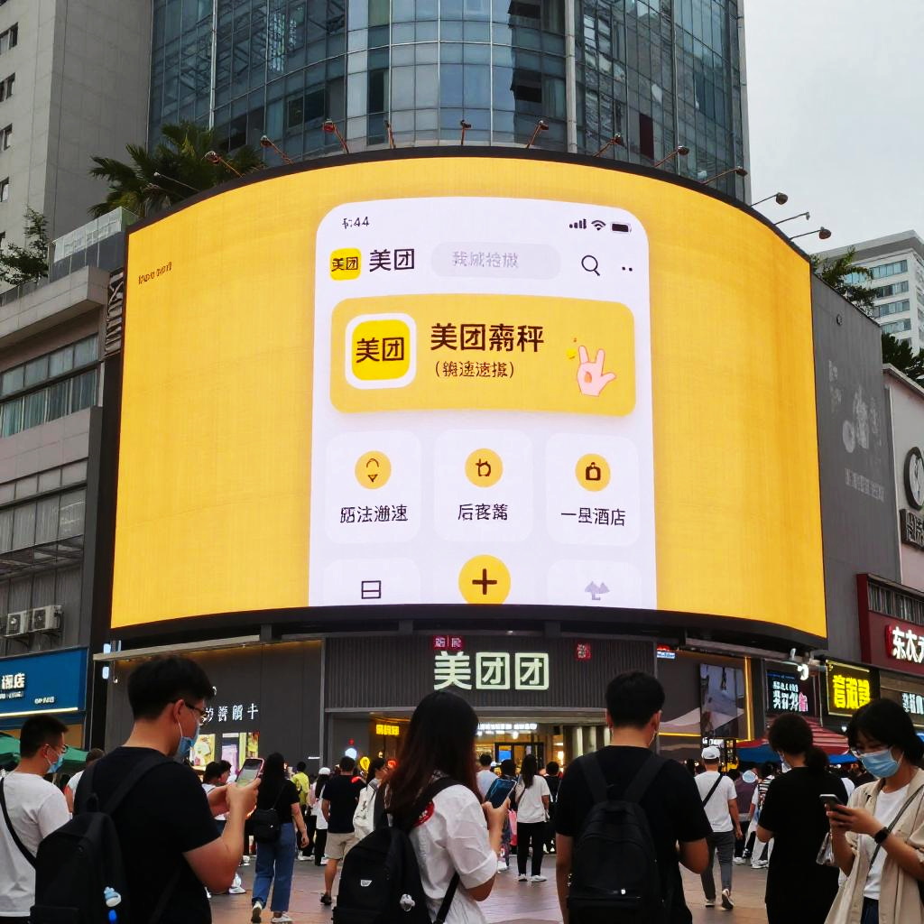 Meituan app interface depicted on a large digital billboard in a crowded Asian city square, surrounded by people using smartphones, with vivid colors and reflections highlighting convenience and connectivity.