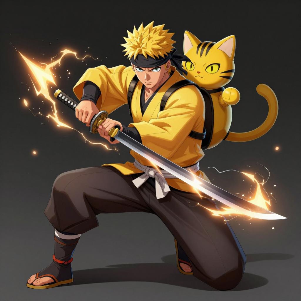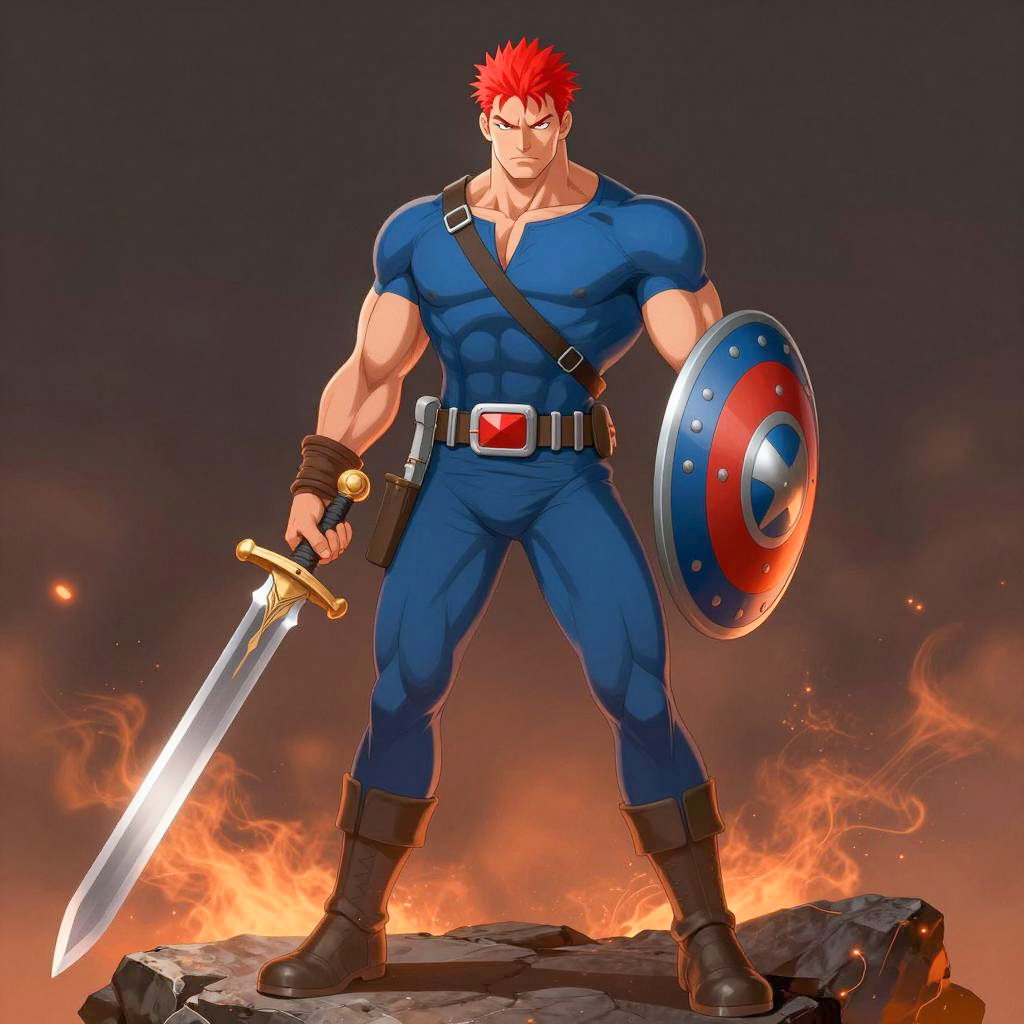 Digital illustration of a muscular anime character with yellow and red flame-like hair, wearing a brown uniform, white cape with red and yellow flames, holding a red and black sword. His intense expression shows a smirk. He stands on a circular base with flame patterns, gripping the sword handle with both hands. His legs are covered in red and yellow flame patterns. The background is dark. The character is standing upright with feet apart. The number of people is one.