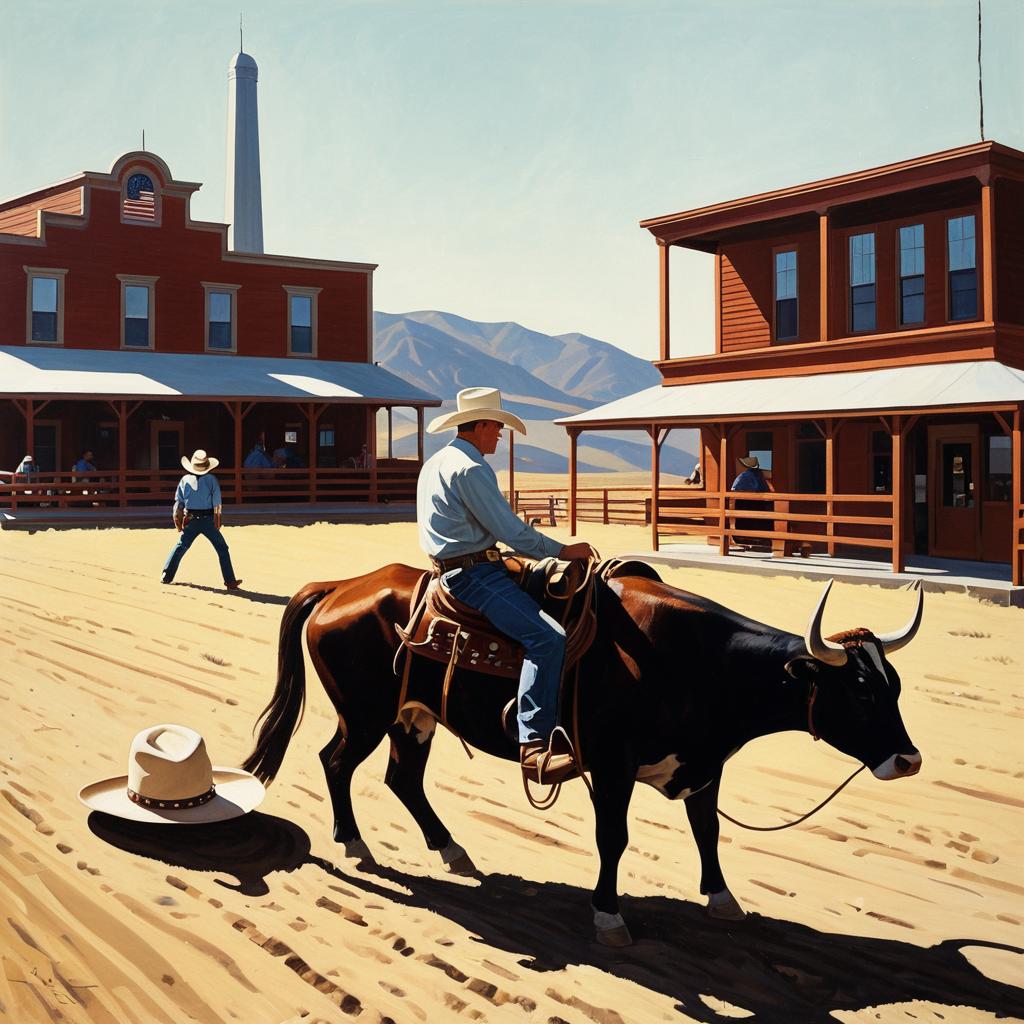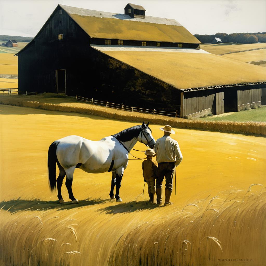 A painting of a farmer and a horse with a barn in a golden field, by Andrew Wyeth.
