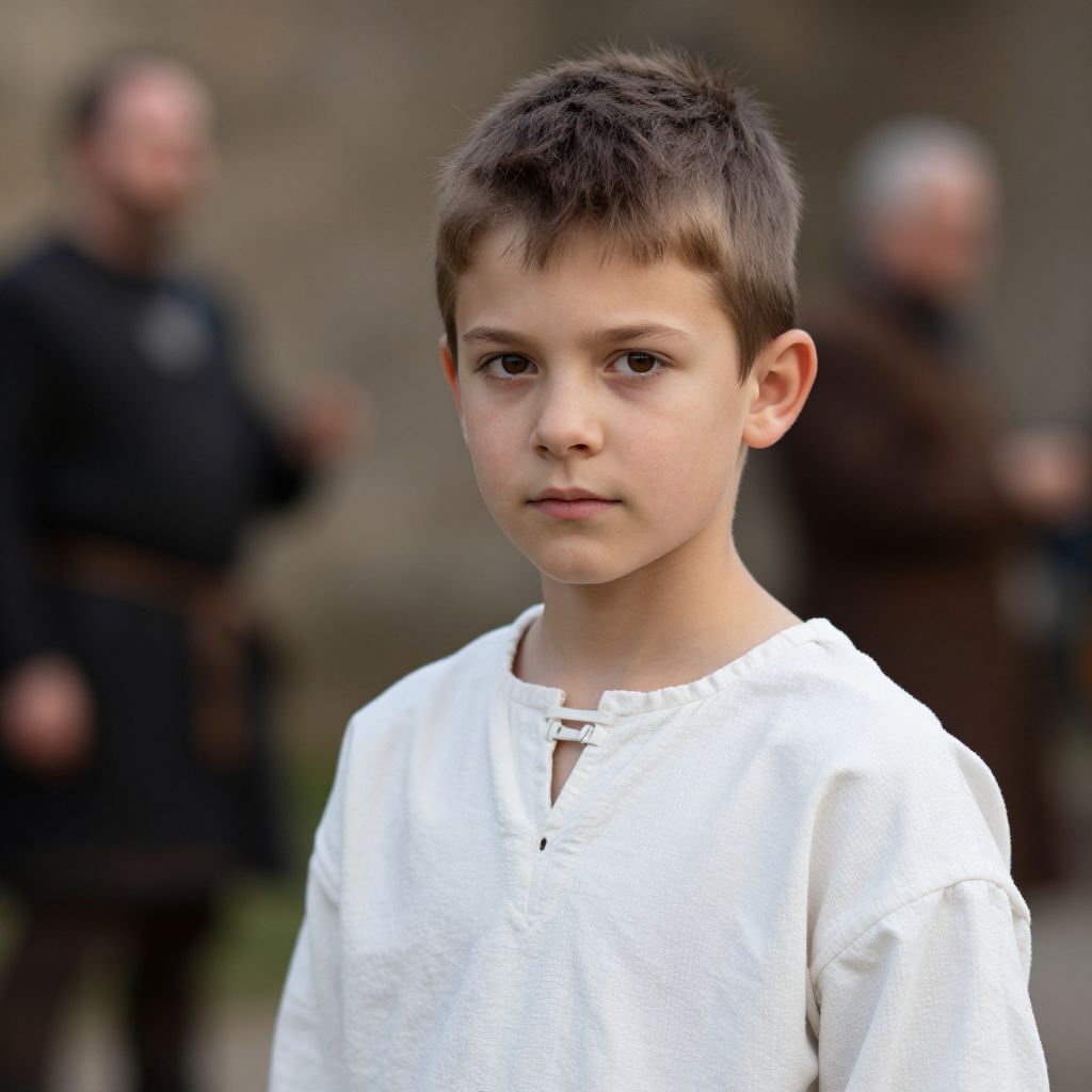 Medieval costume, 1boy, solo, male focus, looking at viewer, blurry, blurry background, short hair, upper body, realistic, child, shirt, white shirt, closed mouth, brown hair