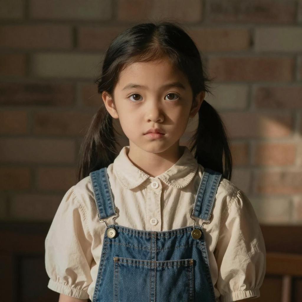 A photograph of a young girl with fair skin and large, expressive brown eyes. She has dark brown hair in pigtails and wears a beige button-up shirt with puffy sleeves, paired with blue denim overalls. The background is a dimly lit brick wall, with sunlight casting soft shadows on her face and clothes. The overall mood is nostalgic and slightly somber.