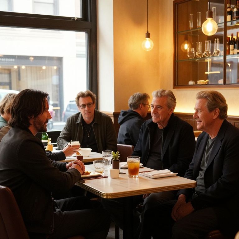 "Megapixels Inside a trendy New York café, beautiful light, cosy, many tables occupied by movie stars, Keanu Reeves (John Wick), Robert De Niro, Al Pacino, Clint Eastwood, Tom Hanks, ...,"