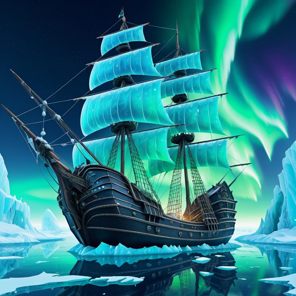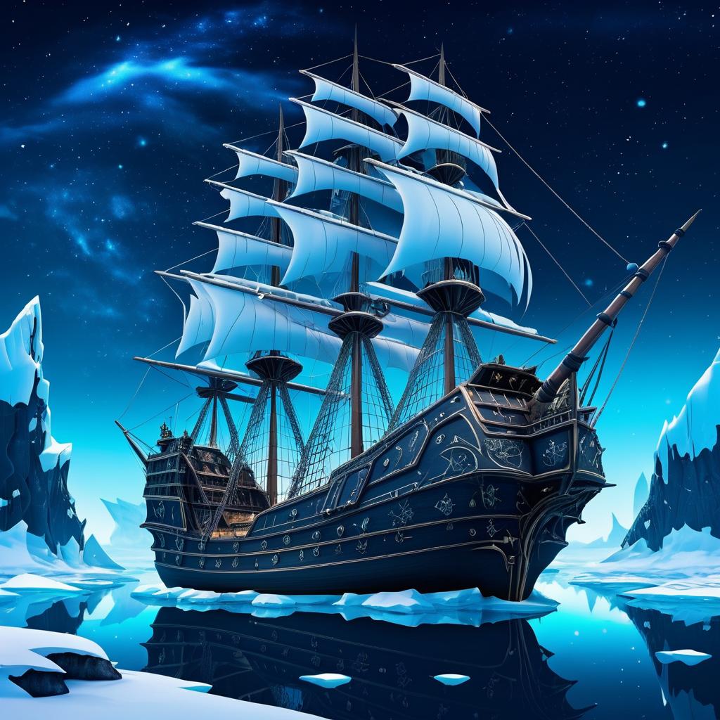 Pirate Ship Sailing Through Frozen Tundra at Night