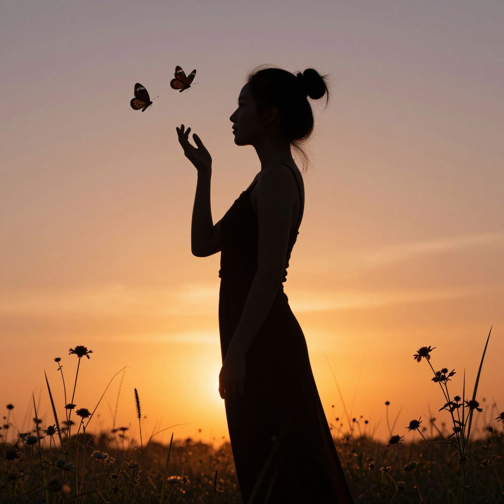 Silhouette Woman at Sunset with Butterflies