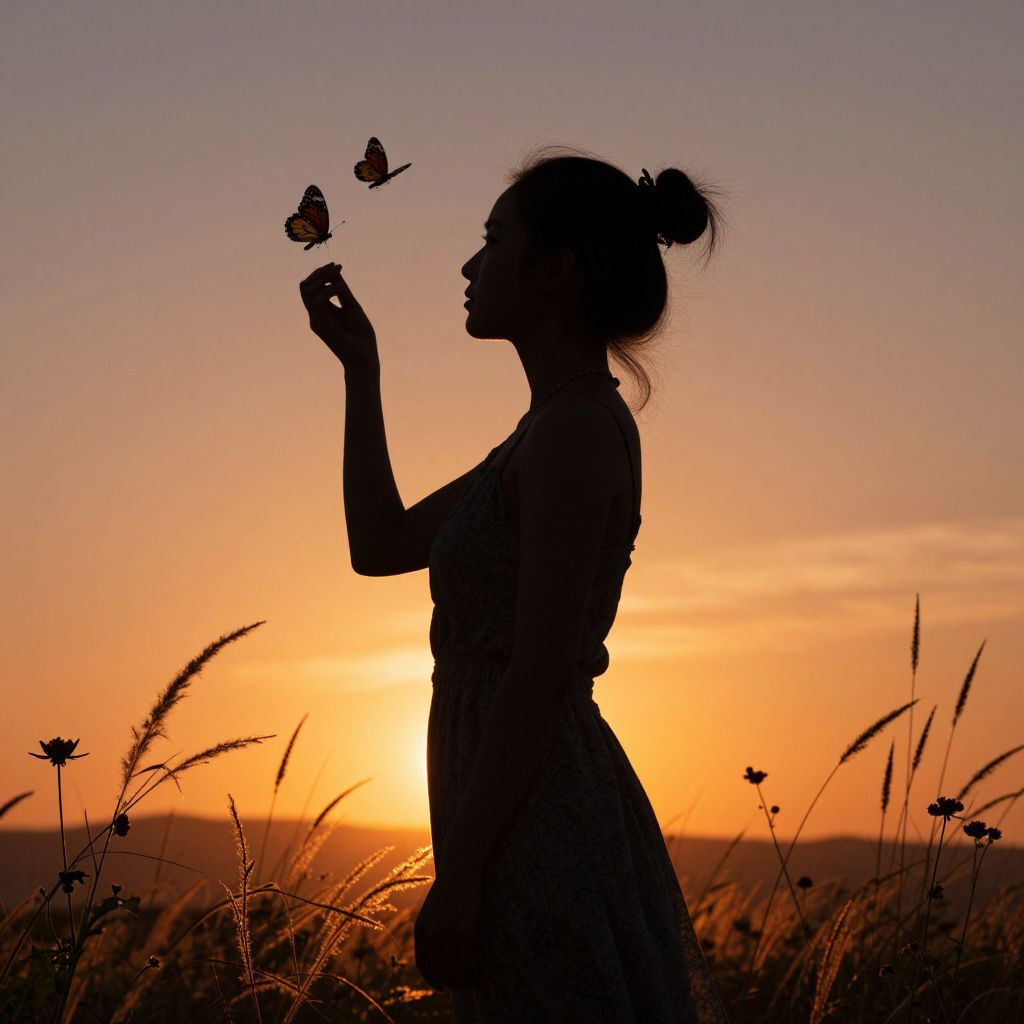 Silhouette of a woman with her hair styled in a bun stands gracefully against a vibrant sunset backdrop, as two butterflies flutter near her face, with tall grasses and wildflowers framing the scene below.