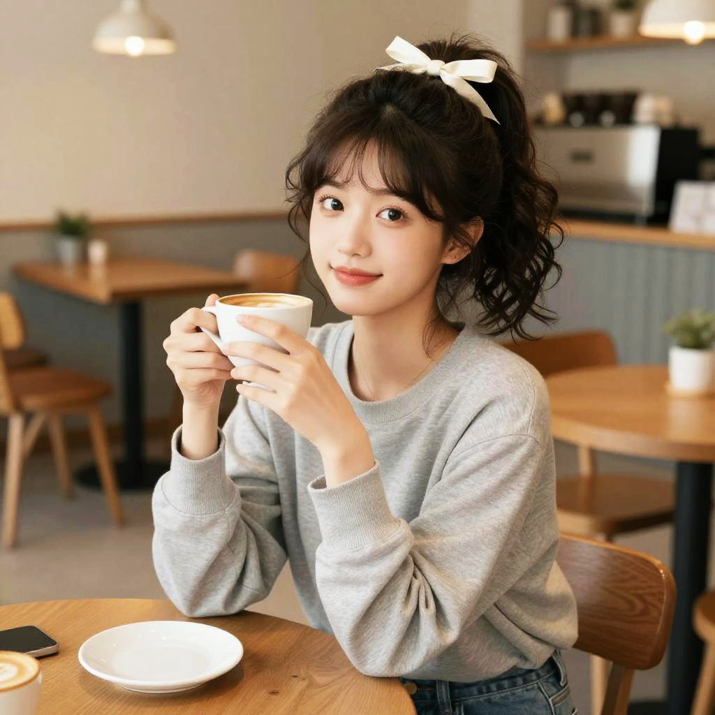 Cute girl pose in a cozy cafe, warm tones, curly hair tied with a ribbon, holding a cup of coffee, bright eyes, casual chic clothing, inviting and friendly ambiance