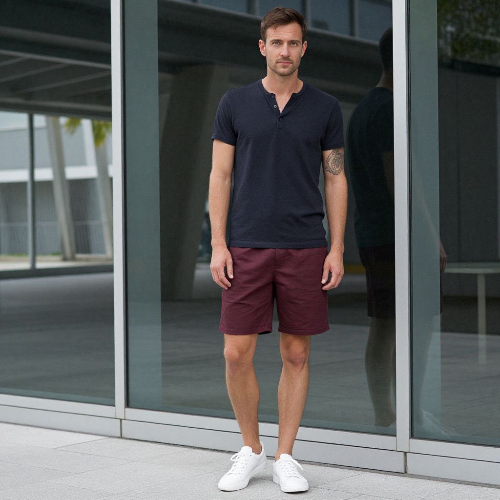 A man, charcoal henley shirt, burgundy shorts, minimalist white tennis sneakers, modern glass facade, Cibachrome style, relaxed expression, sporty and chic vibe. Man has masculine face and piercing eyes