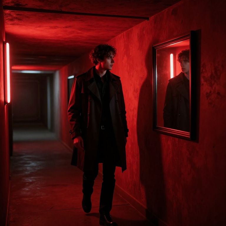Photograph of a man with curly hair, wearing a long black coat, standing in a red-lit, narrow corridor, reflected in a mirror with