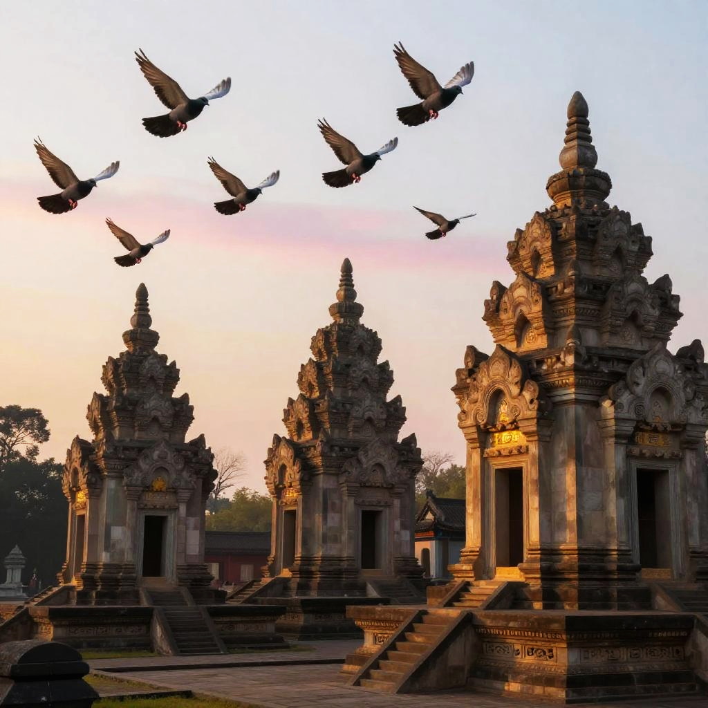 Doves Over Ancient Temple Sunrise