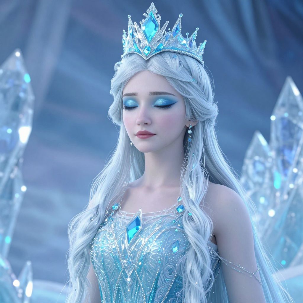 A digital artwork of a fair-skinned, blue-eyed woman with long, silver hair wearing an elaborate, icy blue and silver crown and dress adorned with gemstones and intricate crystal patterns. She's set against a backdrop of glowing, crystalline ice formations that shimmer and sparkle. Her expression is serene, with slightly upturned lips and closed eyes, giving her a ethereal, almost otherworldly presence. The overall tone is cool and mystical.