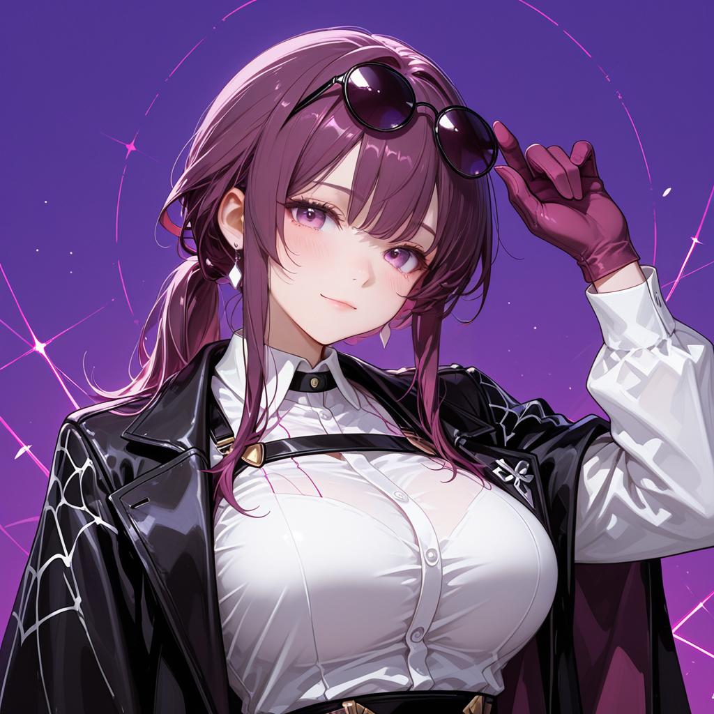 Digital illustration of a mature anime-style woman with long purple hair tied in a ponytail, purple eyes, and a subtle smile. She is wearing a white buttoned shirt, a black jacket with web-like patterns, and purple gloves. Black sunglasses rest on her head. The background is a gradient purple with star-like sparkles. The art style is high quality with detailed shading and highlights.